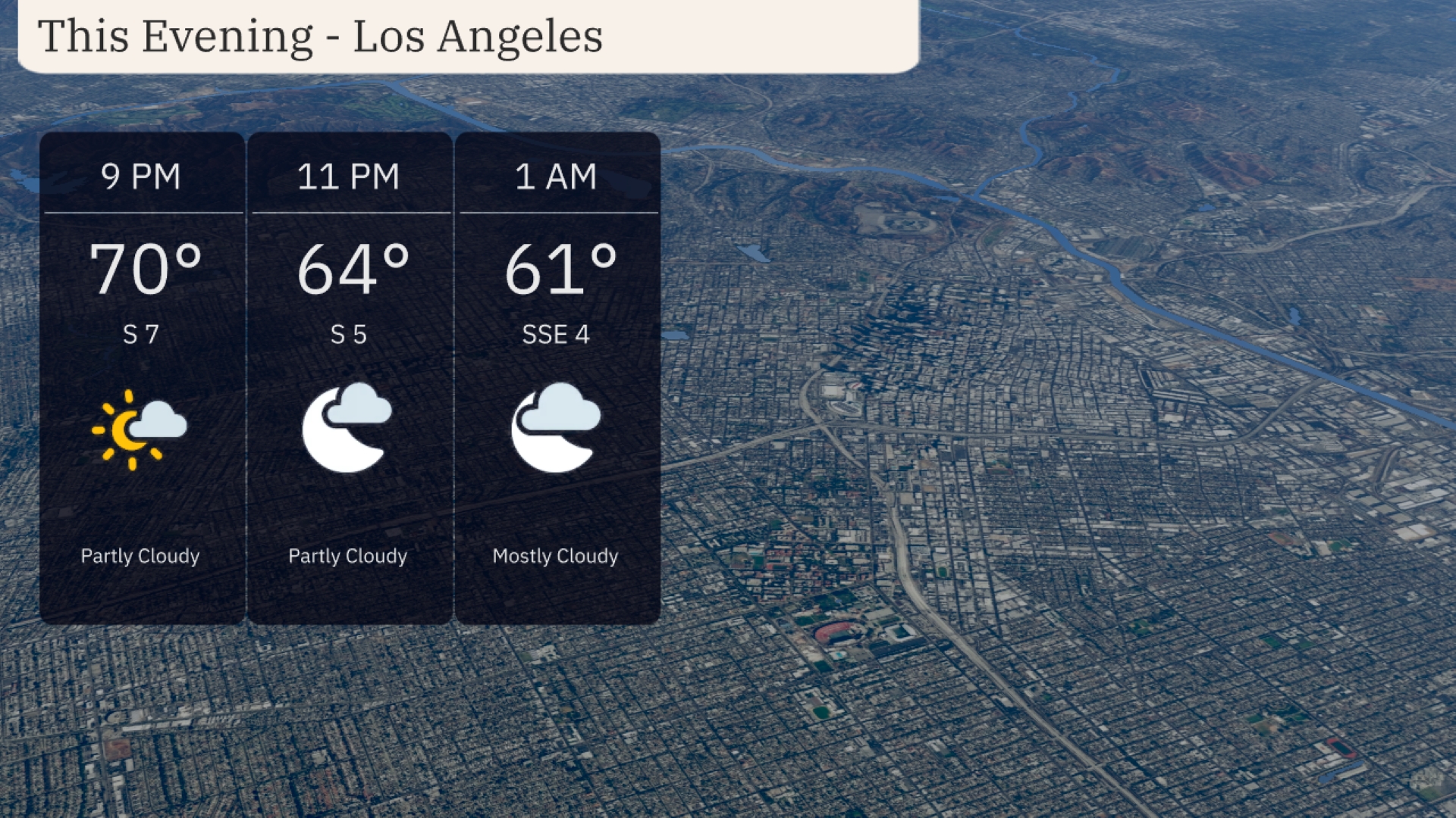 Temperatures in Los Angeles this evening start at 70 degrees at 9 PM, cooling down to 61 degrees by 1 AM. Expect partly cloudy skies transitioning to mostly cloudy later, with a gentle south wind around 7 mph shifting southeast at 4 mph as the night progresses. It’s a calm night, perfect for outdoor plans!