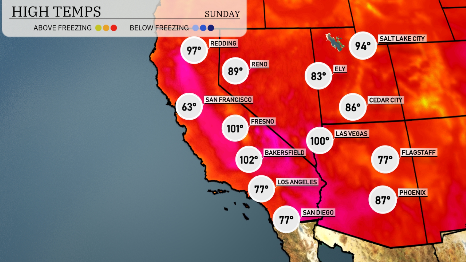 Tonight Las Vegas will see a low of 76 degrees, while Phoenix stays warm at 76 as well. Expect cooler conditions in Flagstaff with a low of 48 degrees, and Ely will drop to a brisk 39 degrees. Fresno will have a low of 63, and Bakersfield will cool off to 64 degrees. San Diego will rest at 60 degrees tonight.