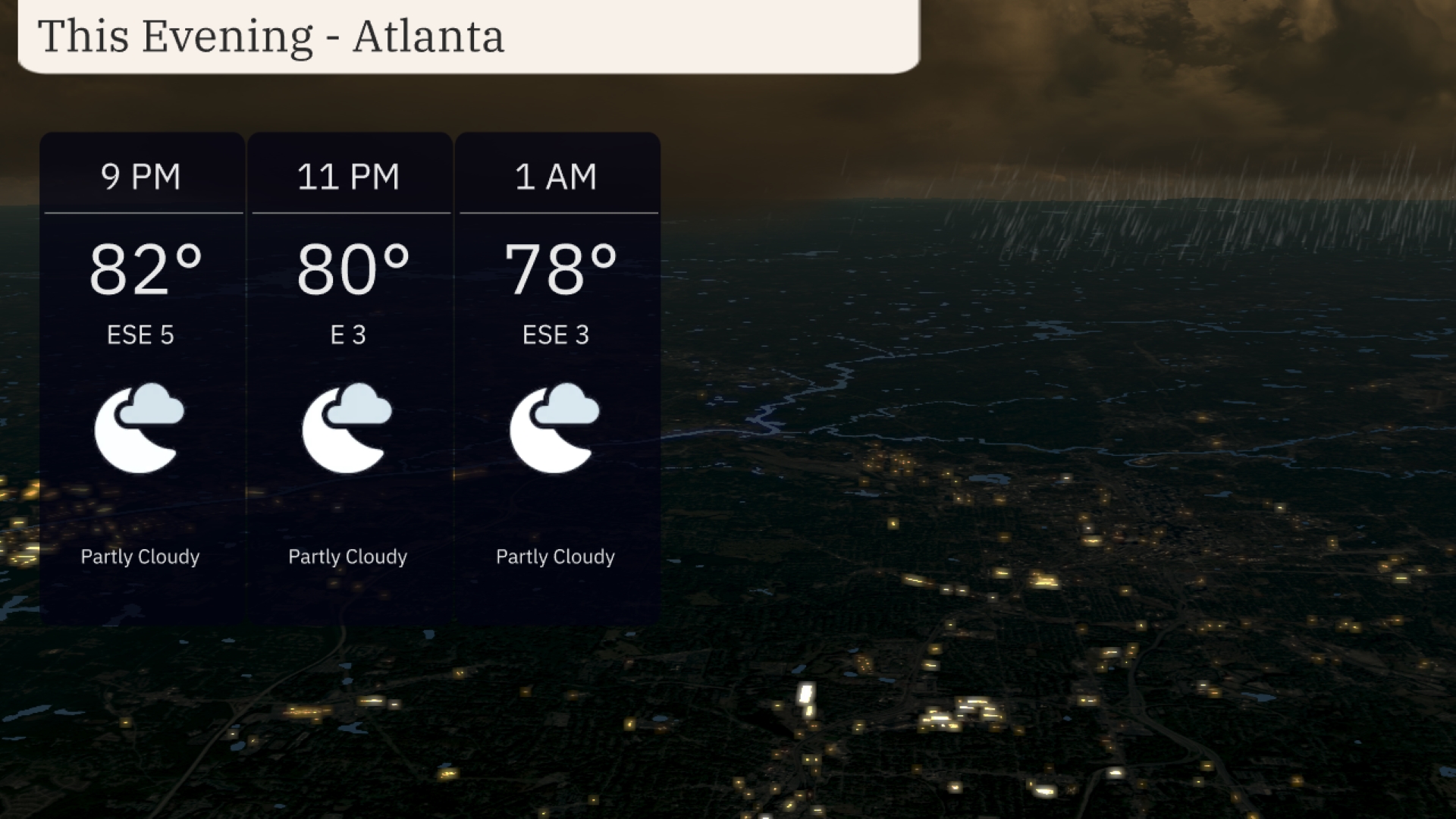 Temperatures this evening in Atlanta will remain warm, starting at 82 degrees at 9 PM and gradually cooling to 78 degrees by 1 AM. Expect partly cloudy skies with a gentle easterly to east-southeast wind at around 3 to 5 miles per hour. Enjoy a calm night under a tranquil, partly cloudy sky.