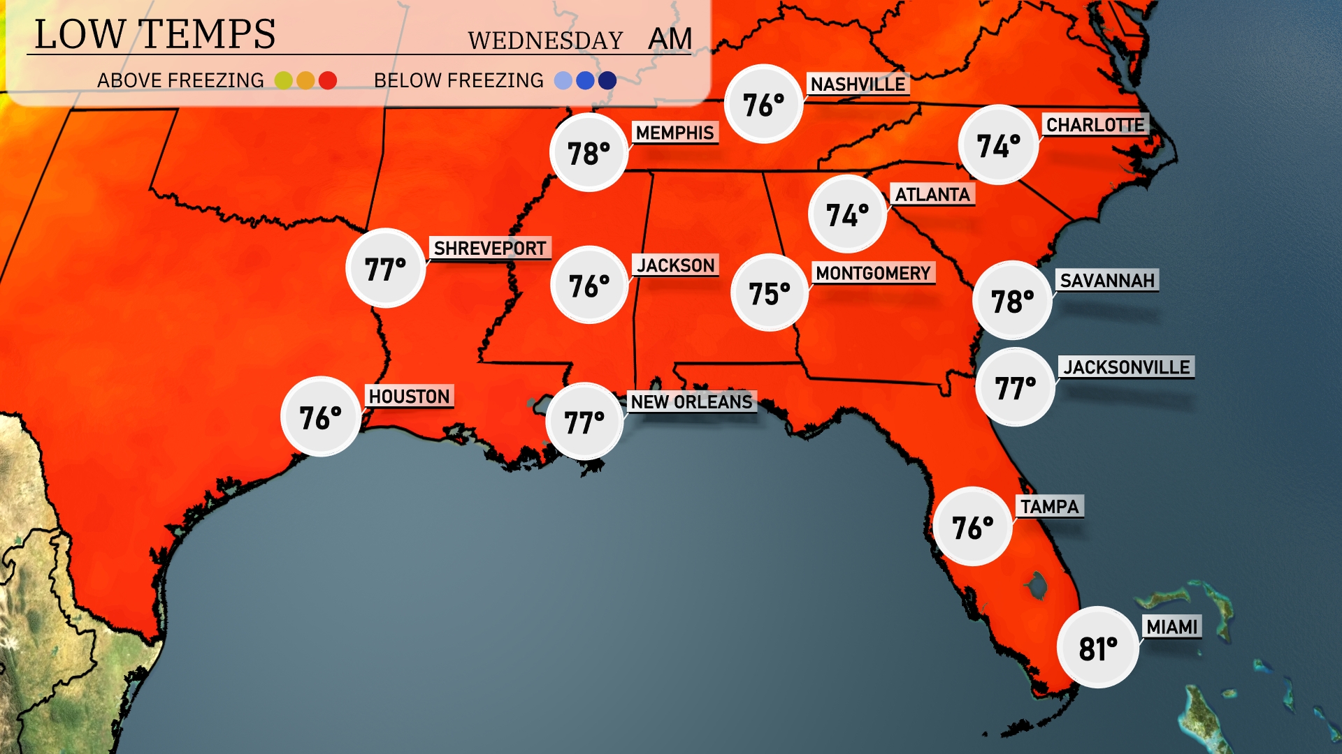 Tonight, temperatures will remain warm across the Southeast. Memphis is expected to see a low of 76 degrees, while Nashville will dip slightly to 75. Jackson is forecasting a low of 76, and Montgomery will register 75 degrees. Atlanta will experience a mild night at 74, with Jacksonville not far behind at 77.