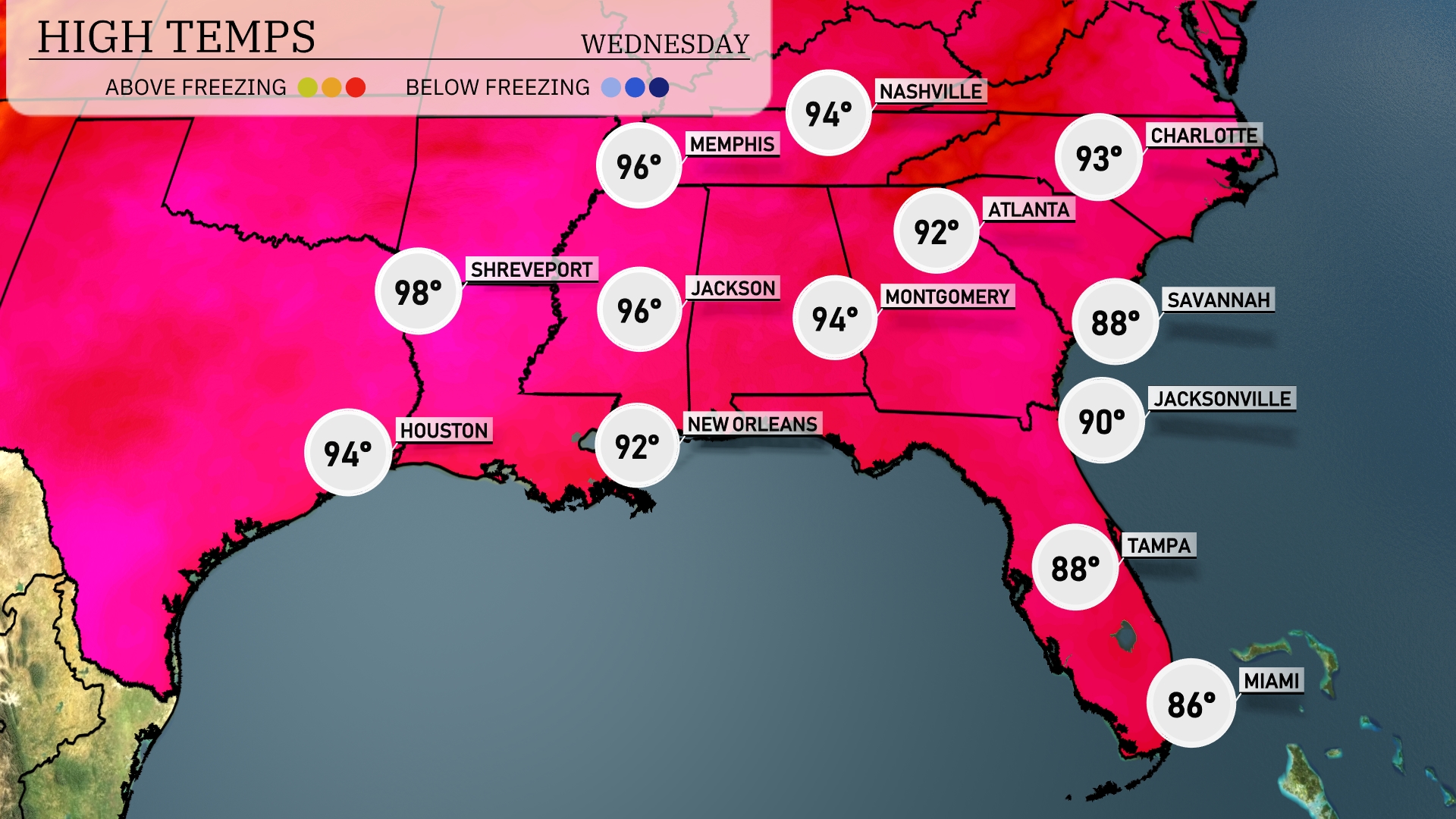 Tomorrow, Houston is set to reach a high of 94 degrees, while Shreveport will see an even hotter 98 degrees. New Orleans is expected to hit 92, and both Memphis and Jackson are forecasted for highs of 96 degrees. Montgomery will be slightly cooler at 94 degrees, and in Atlanta, look for a high of 92. The warm air mass influencing these temperatures is resulting in above-average highs across much of the Southeast, leading to a noticeably steamy day.