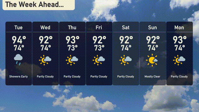 Monday: Partly cloudy with a high of 93 degrees and a low of 74 degrees.