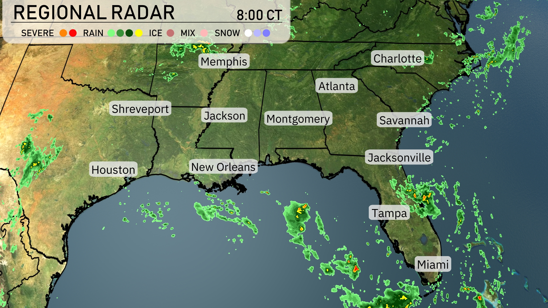 A look at the Southeast regional radar indicates scattered rain showers moving into Jacksonville and Tampa, with cloud cover extending northward towards Montgomery and Atlanta. Rain is showing up along the Gulf Coast near Houston and New Orleans, bringing some light precipitation. Miami is surrounded by isolated rain cells, which could lead to brief downpours. Most of the interior Southeast, including Charlotte and Memphis, remains under clear or partly cloudy conditions for now.