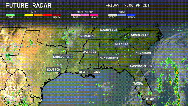A cold front is progressing eastward, bringing potentially severe thunderstorms from Shreveport to Montgomery by late Friday night. Expect heavy rainfall and gusty winds with this system, especially impacting Memphis and Jackson with scattered showers. By Saturday, the front will slow, maintaining conditions conducive to thunderstorms from New Orleans through Jacksonville, raising the risk of flash flooding. Temperatures will drop behind the front, bringing cooler, drier air to Nashville and Charlotte. Keep an eye on changing weather patterns as this system could lead to isolated severe weather impacts across the southeast.