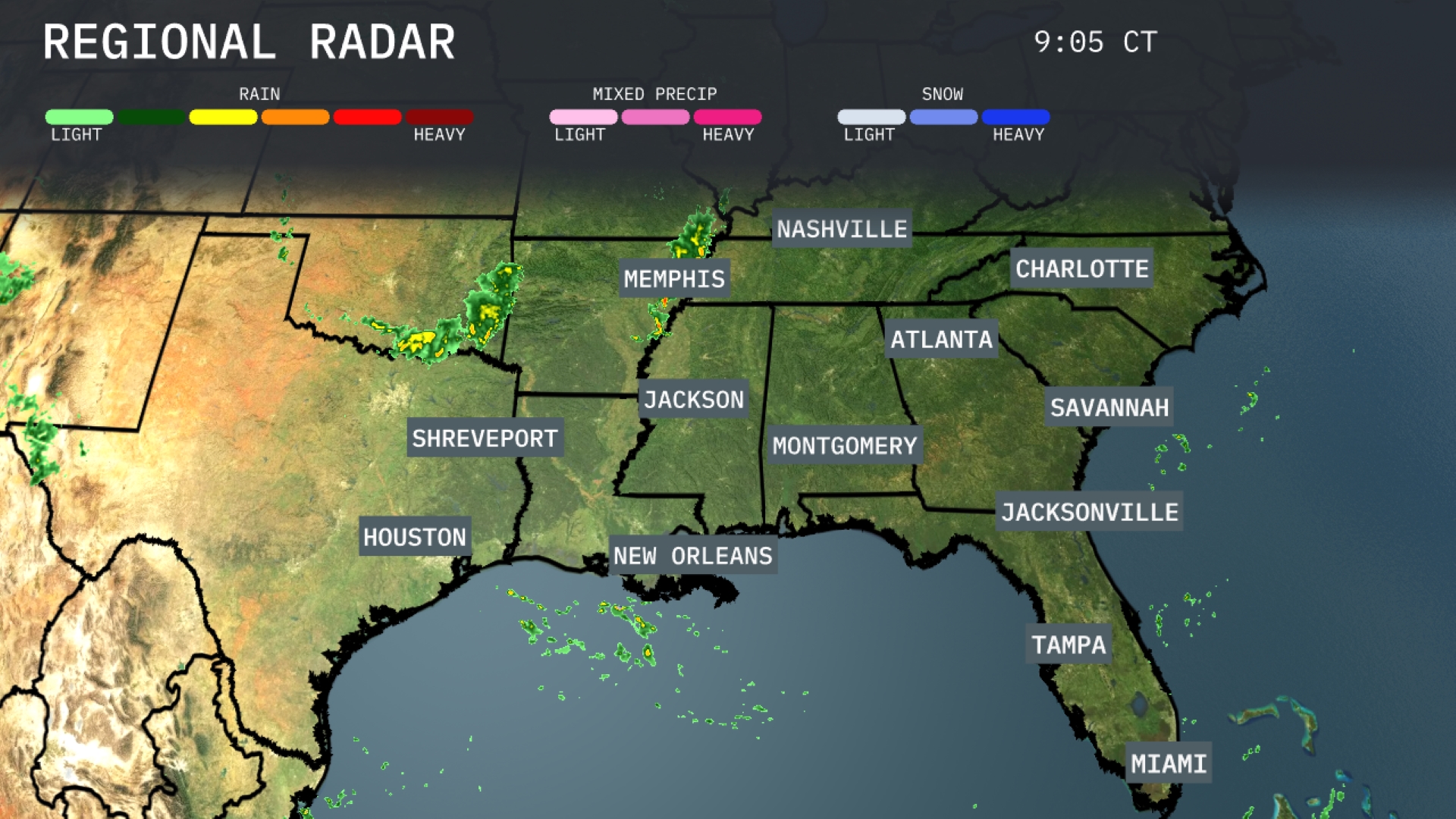 A line of showers is making its way through Arkansas towards Memphis, bringing moderate rain to the area. New Orleans and its vicinity are experiencing scattered rain showers moving east, indicating wet conditions along the Gulf Coast. Meanwhile, light rain is moving into coastal regions of Georgia, including Savannah, as clouds increase across the region. Areas from Atlanta to Charlotte are currently dry but cloud cover is beginning to increase ahead of the rain expected to move in later.