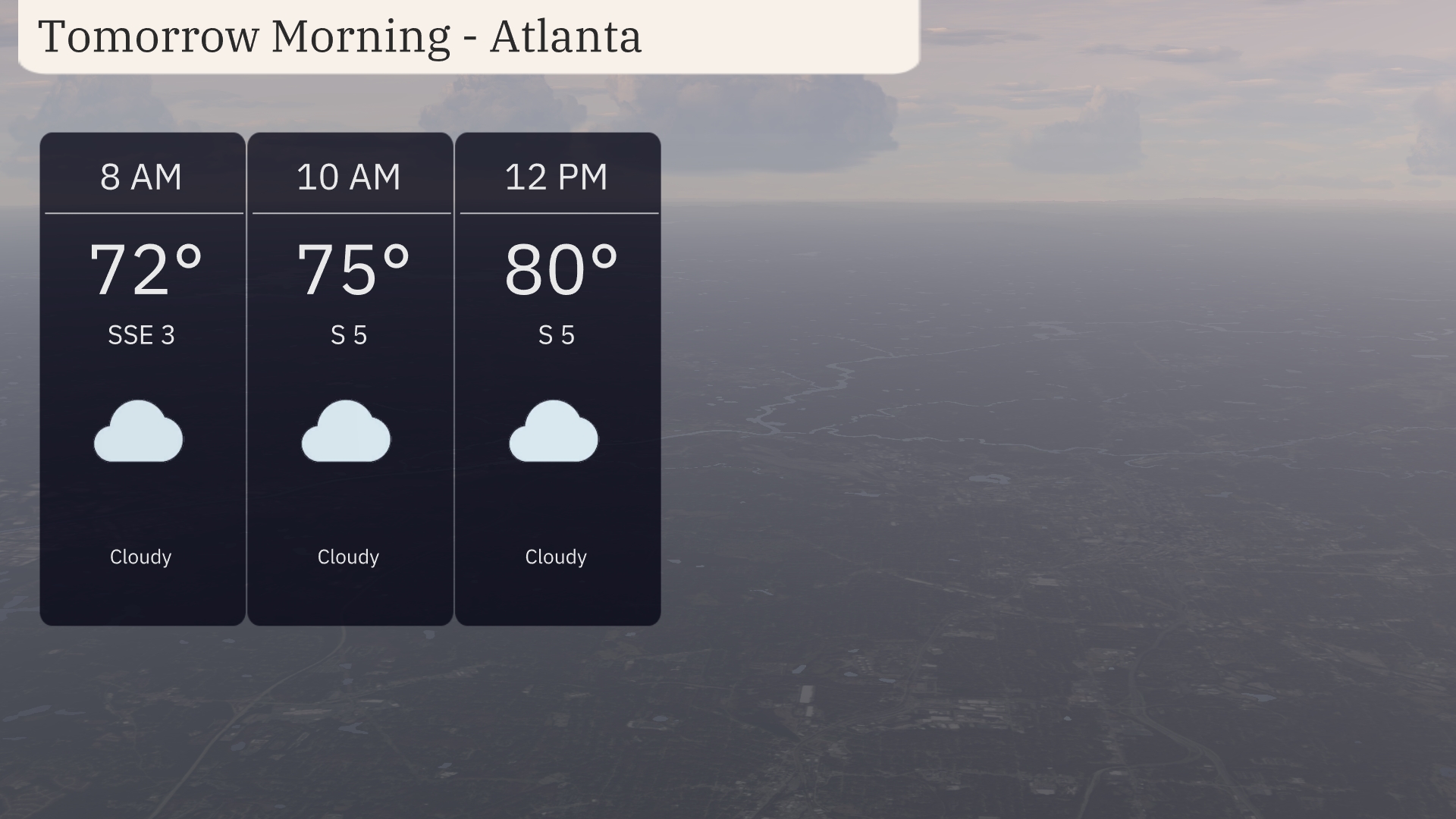 Tomorrow morning in Atlanta, temperatures start at 72 degrees at 8 AM with a gentle southeast-southeast wind at 3 miles per hour. By 10 AM, temperatures will rise to 75 degrees with winds shifting slightly to the south at 5 miles per hour. Expect a cloudy day, with the temperature reaching 80 degrees by noon while the southerly winds continue.