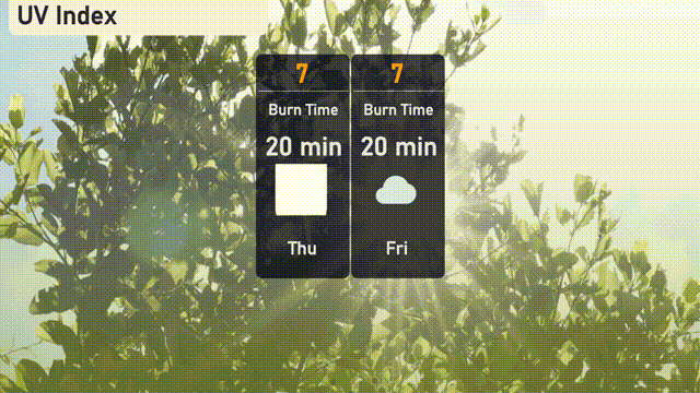 The UV index in Atlanta is a high 7 today and tomorrow, with a sun exposure burn time of about 20 minutes in direct sunlight.