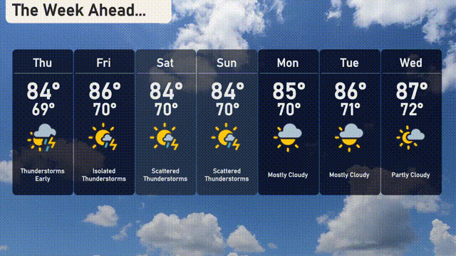 For the 7 Day Outlook in Atlanta: Thursday: Thunderstorms early, with a high of 84 degrees and a low of 69 degrees. Friday: Isolated thunderstorms with temperatures reaching up to 86 degrees, dipping to 70 at night. Saturday: Scattered thunderstorms expected, highs around 84 degrees, lows near 70 degrees. Sunday: More scattered thunderstorms, with a high of 84 degrees and a low of 70. Monday: The weather turns mostly cloudy with the temperature peaking at 85 degrees, cooling down to 70 at night. Tuesday: Continued cloudy skies with highs reaching 86 degrees and lows of 71 degrees. Wednesday: Partly cloudy conditions with temperatures rising to 87 degrees during the day and 72 degrees overnight.
