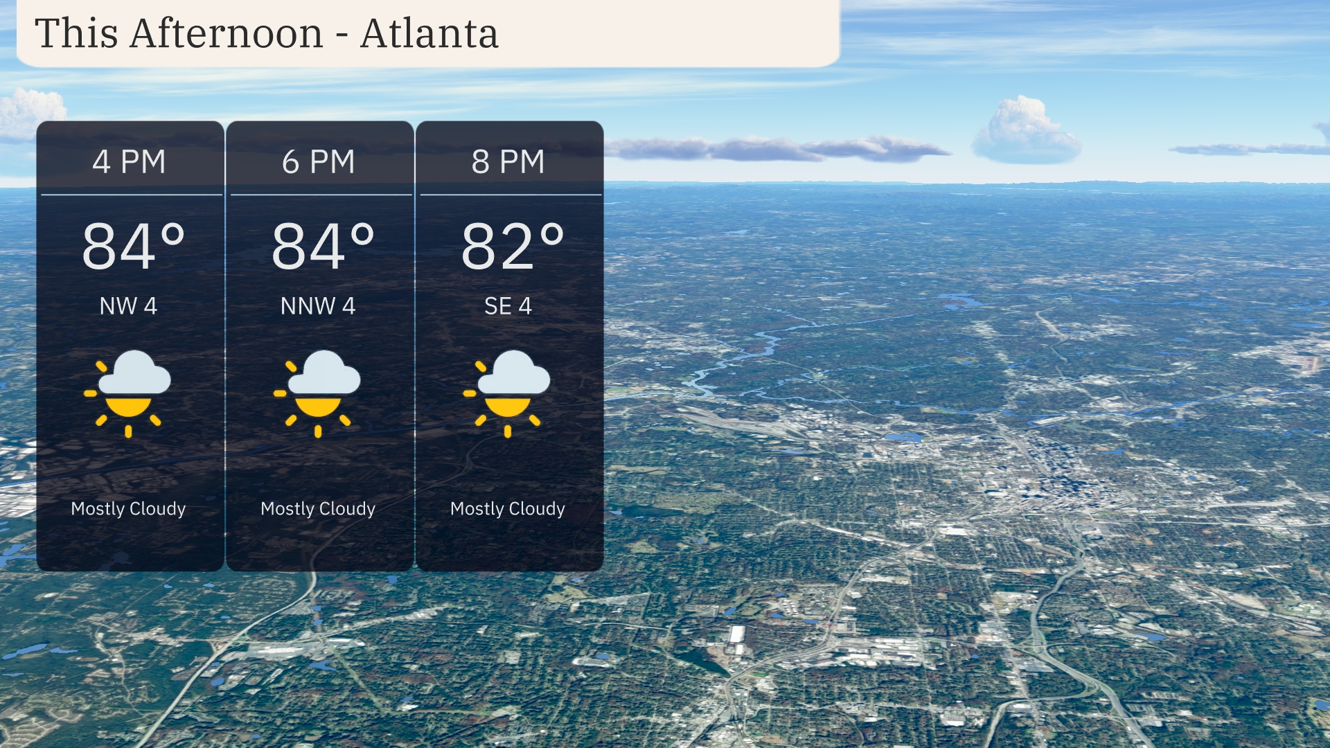 Afternoon temperatures in Atlanta are expected to hold at 84 degrees with mostly cloudy skies. Winds will shift from northwest at 4 mph to north-northwest by evening. Heading into the evening, winds will gently turn southeast at 4 mph.