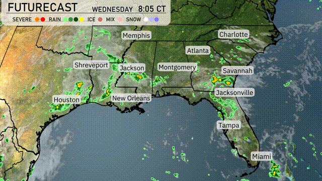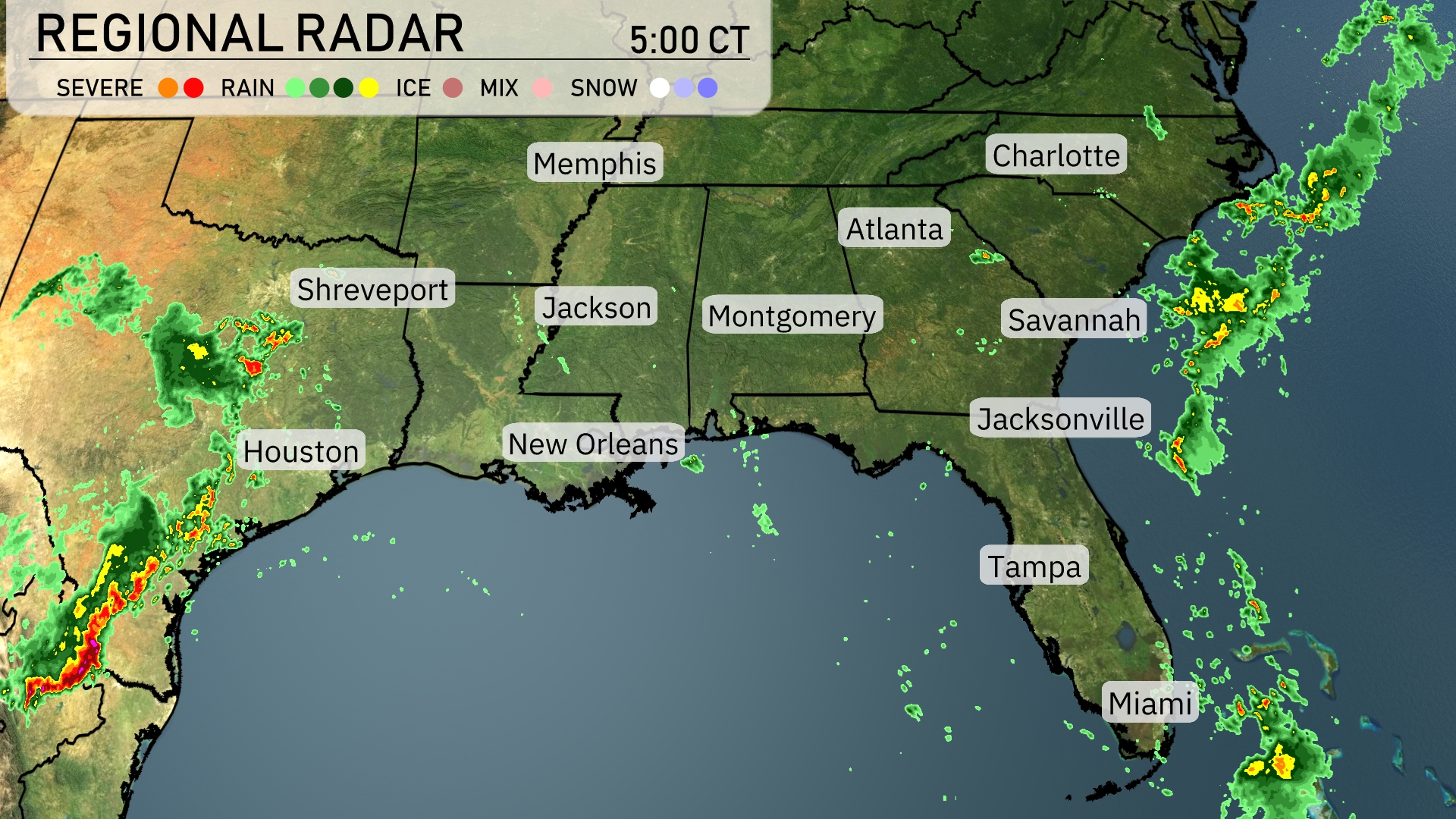 A storm system is approaching Houston from the west, bringing intense rainfall and the potential for severe weather. Showers and thunderstorms are extending eastward from Shreveport to Jackson, suggesting a wet commute for these areas. The Georgia coast, including Savannah, is seeing some scattered showers moving offshore, impacting Charleston and the surrounding Low Country. Areas like Miami are enjoying clear skies today.