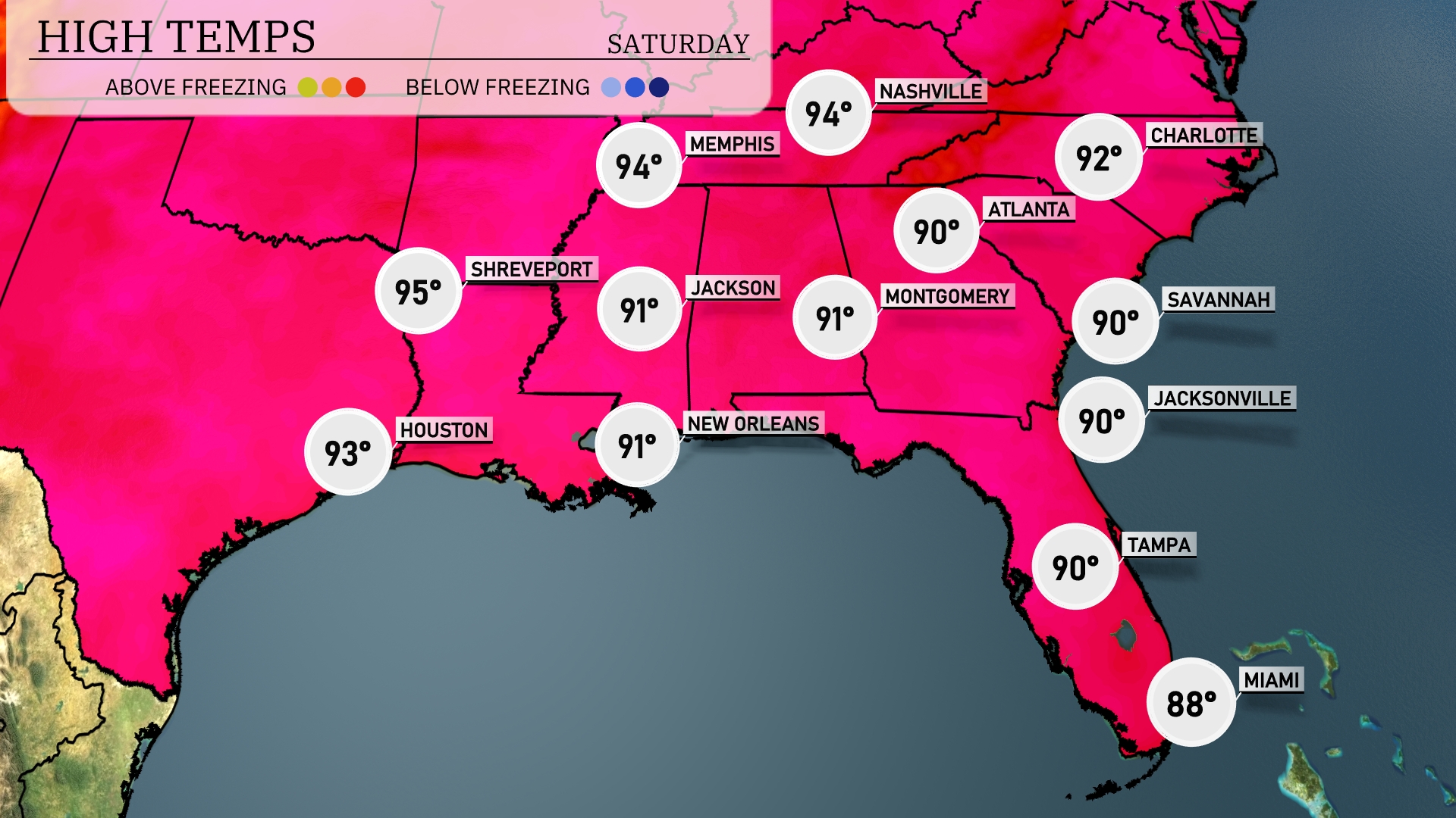 This afternoon in the Southeast, temperatures are heating up significantly. In New Orleans and Jackson, expect highs around 91 degrees, while Houston reaches a sizzling 93. Shreveport will be even warmer at 95 degrees. Atlanta is forecasted to hit 90 degrees, with Savannah and Jacksonville also warming to 90. Over in Florida, Tampa sees a pleasant high of 90 degrees, while Miami lingers a bit cooler at 88.