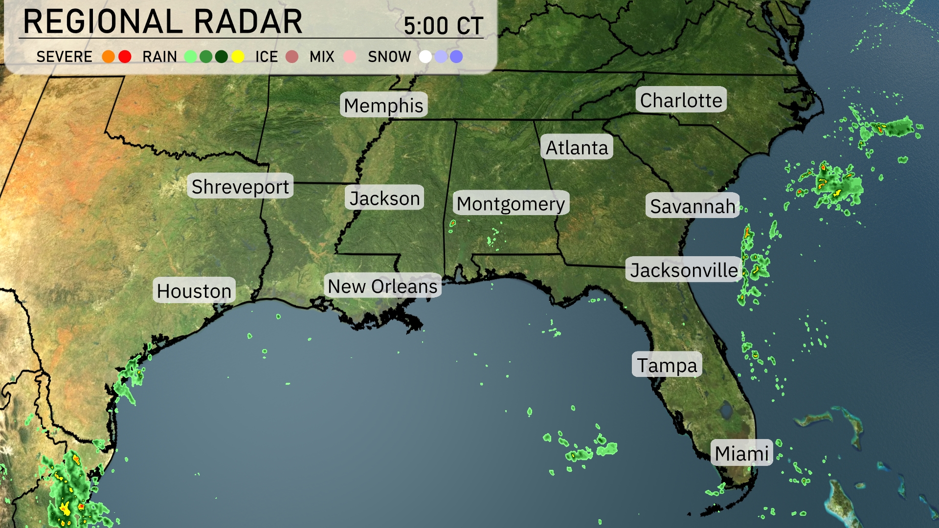 In the Southeast region, we see a relatively calm radar with some developing weather systems. Near the Gulf Coast, spotty rain showers are evident around New Orleans and Houston, moving gently northeast. Montgomery and Jacksonville are under some increasing cloud cover, with light rain showers expected to develop later in the day. Cities like Atlanta and Charlotte are enjoying clear skies, while Memphis remains calm with no precipitation in sight.