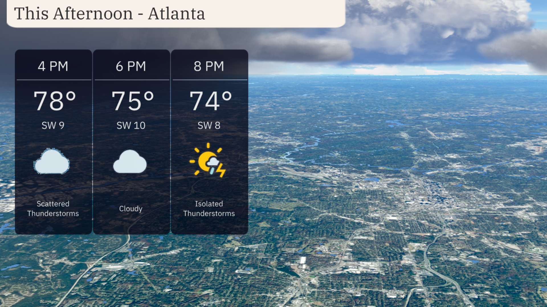 Atlanta’s afternoon forecast shows temperatures reaching up to 78 degrees with scattered thunderstorms. Winds will be from the southwest at 9 miles per hour, gradually shifting to 10 miles per hour by 6 PM, as skies turn cloudy with a temperature of 75 degrees. By 8 PM, isolated thunderstorms are expected, with temperatures slightly cooling to 74 degrees.