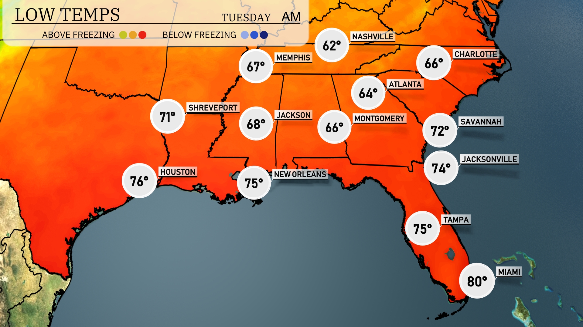 Tonight, low temperatures will be quite mild across the Southeast. Memphis will cool down to 62 degrees, while Nashville drops to 64. Montgomery is expected to see a low of 66 degrees, and Jackson will settle at 68. In contrast, Miami remains warmer with a low of 80 degrees.