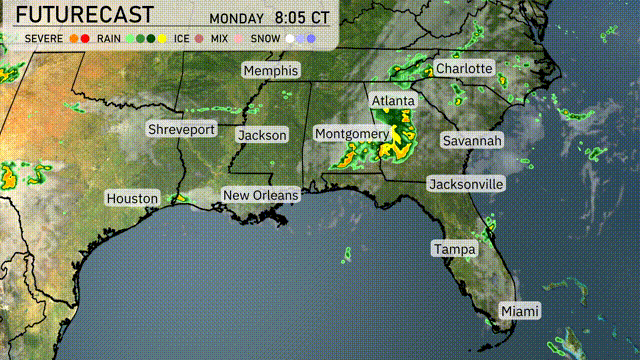 A line of strong thunderstorms is sweeping eastward across the Southeast, with heavy precipitation impacting areas from Jackson to Montgomery. Shreveport is drenched with intense rain, while Jackson and Montgomery are directly under the storm’s path. Rain is extending into Georgia, approaching Savannah and Jacksonville, bringing cloud cover and showers to these areas. Houston and New Orleans see light to moderate rain as the weather system advances.