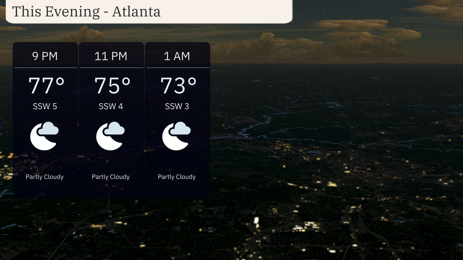 For this evening in Atlanta, expect partly cloudy skies and mild conditions. Temperatures will gradually decrease from 77 degrees at 9 PM to 73 degrees by 1 AM. Winds will be gentle from the south-southwest, ranging from 5 to 3 miles per hour throughout the evening.