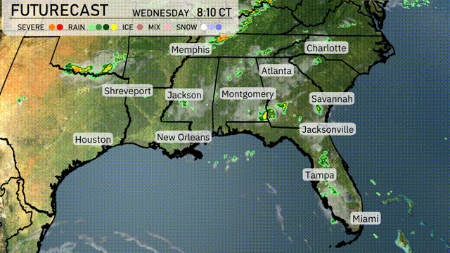 A cold front approaches the Southeast, with increasing chances of thunderstorms from Houston to Tallahassee. By mid-morning Wednesday, expect rain showers stretching from Memphis through Atlanta with potential heavy downpours and isolated severe storms. Keep an eye on localized flooding, especially in urban areas along the Gulf Coast. Temperatures remain warm ahead of the front but will drop slightly post-frontal passage. Prepare for gusty winds and be alert for any severe weather watches or warnings issued by the N-W-S.