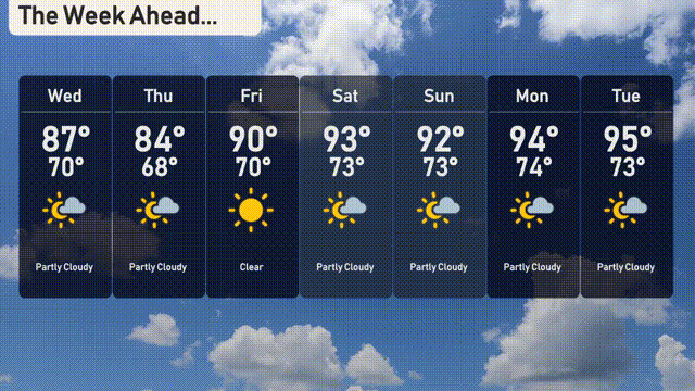 Wednesday: Expect partly cloudy skies with a warm high of 87 degrees and a low of 70 degrees.