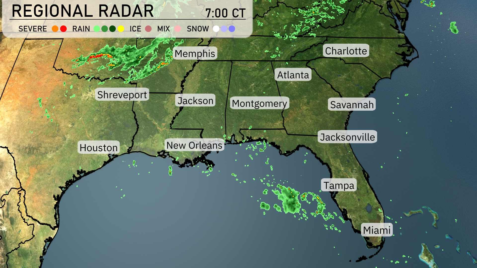 On the Regional Radar, scattered showers are moving across parts of Mississippi and Alabama, with considerable precipitation around Memphis extending towards Jackson. Shreveport and New Orleans are experiencing light rain, as a line of moisture continues to push east. In Georgia, Atlanta remains dry for now, but increasing cloud cover suggests forthcoming rain. The Florida Panhandle and areas near Jacksonville are seeing isolated showers.