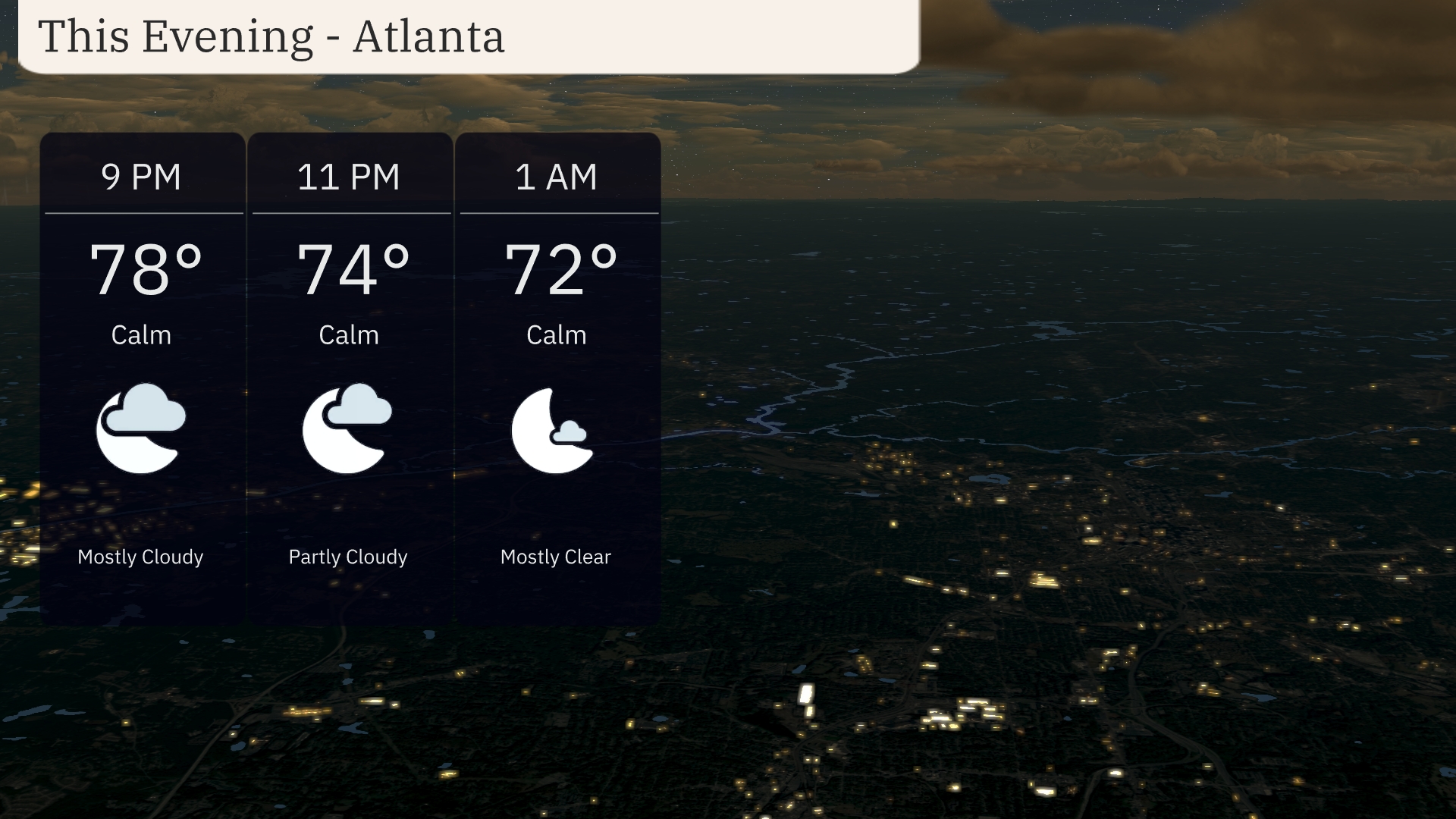 For this evening in Atlanta, temperatures gradually decrease from 78 degrees at 9 PM to 72 degrees by 1 AM. The skies transition from mostly cloudy to mostly clear as the night progresses.