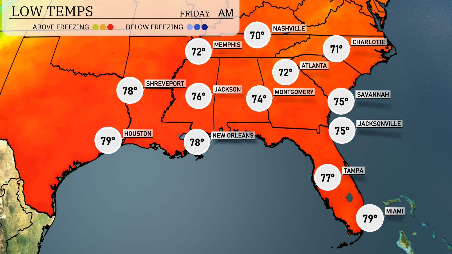 Tonight, expect mild temperatures across the Southeast. Memphis will drop to 70 degrees, while Nashville cools down to 72. Shreveport will see a low of 78, and Jackson is expected to rest at 76 degrees. Atlanta will have a low of 72, with Montgomery slightly cooler at 74. The hottest spots will be in Florida, where both Tampa and Miami hover around 77 and 79 degrees, respectively.
