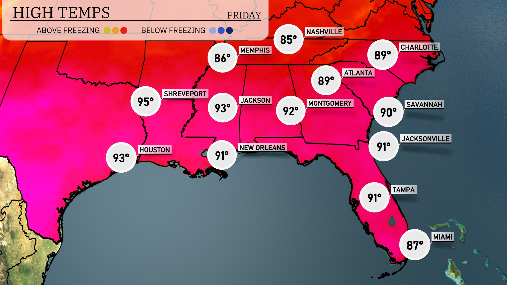 Tomorrow in the Southeast, expect high temperatures to soar across the region. Atlanta will reach a warm 89 degrees, while Montgomery tops out at 92. Farther south, temperatures in Jacksonville and Savannah will hit 91 and 90 respectively. New Orleans will see a high of 91 degrees, and over in Houston, anticipate a warm 93. Shreveport remains the hottest spot of the day at 95 degrees.