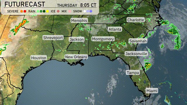 An active weather day is ahead for the Southeast region, with scattered thunderstorms developing from Jackson to Atlanta as a cold front approaches. Areas like New Orleans and Memphis may see intense downpours and gusty winds, especially in the afternoon. Isolated severe weather, including the risk of damaging winds, is possible as the front moves eastward. Temperatures will remain rather warm but expect cooler air to filter in behind the front by Thursday night, bringing a refreshing change just in time for the weekend.