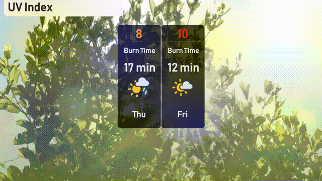 The UV index in Atlanta will be very high on Thursday with a value of 8, suggesting a burn time of about 17 minutes in direct sunlight. By Friday, the index peaks to an extreme level of 10, with a burn time of just 12 minutes!