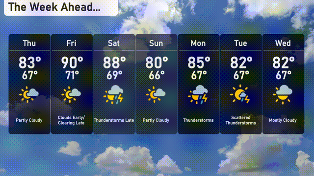 Thursday: Partly cloudy skies with a warm high of 83 degrees and a low of 67.
