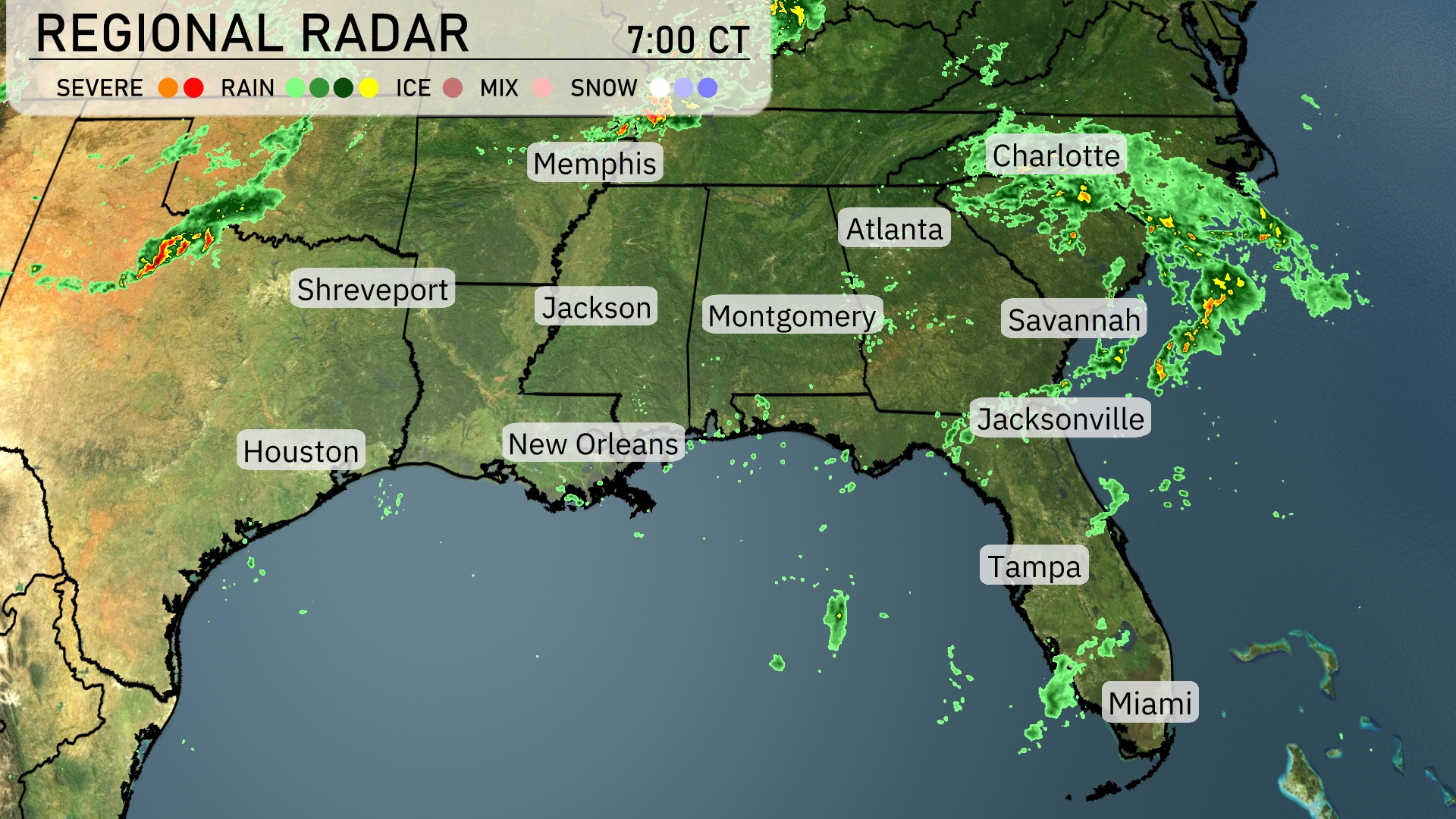 On the Regional Radar, a line of rain showers is sweeping eastward, moving towards the Carolinas. The strongest precipitation is currently affecting Savannah and Jacksonville, with heavy rain advancing toward Charlotte and Atlanta. Clouds and light rain are also approaching Montgomery from the west. Shreveport is dealing with some rain as showers in Texas move closer. Most of the Gulf Coast, including areas like Miami and Tampa, enjoys drier conditions for now.