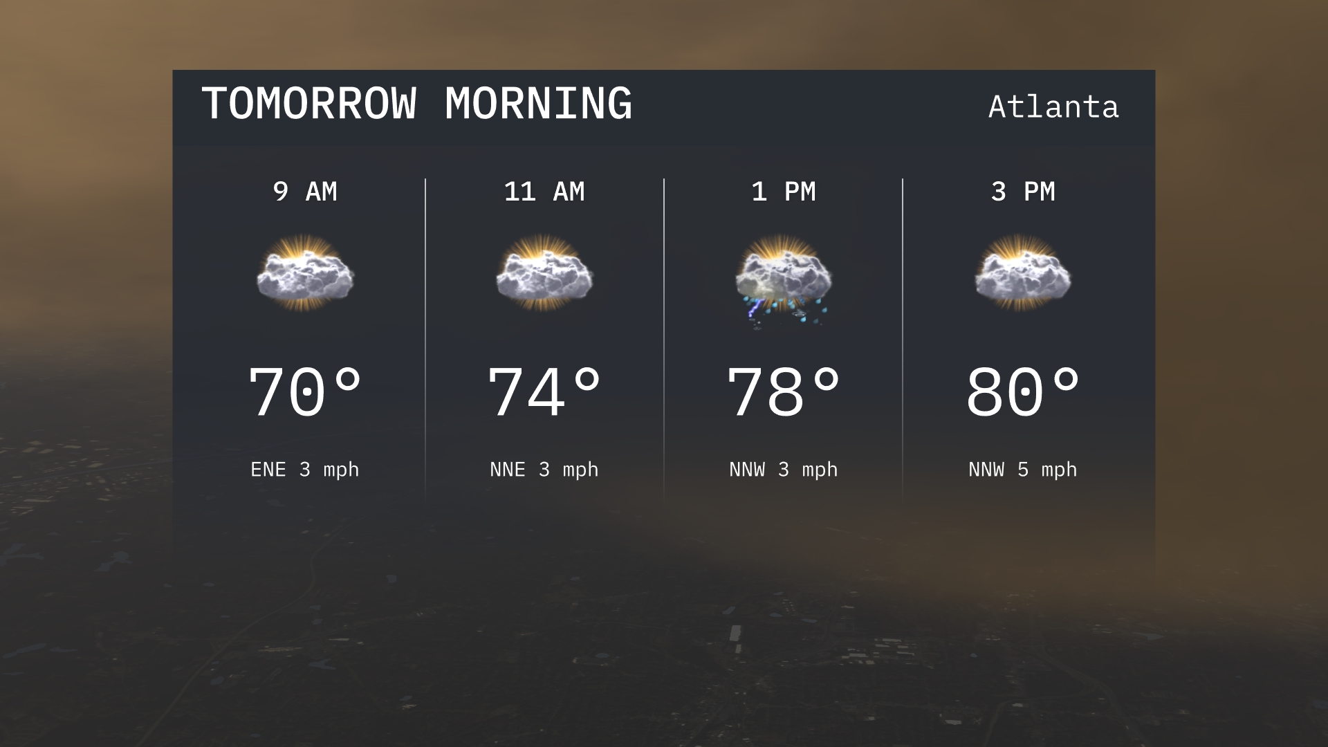 Tomorrow morning in Atlanta starts off with temperatures at 70 degrees at 9 AM, accompanied by calm east-northeast winds. By 11 AM, the temperature rises to 74 degrees with winds shifting to north-northwest. Expect partly cloudy skies throughout the morning, providing a pleasant atmospheric feel.