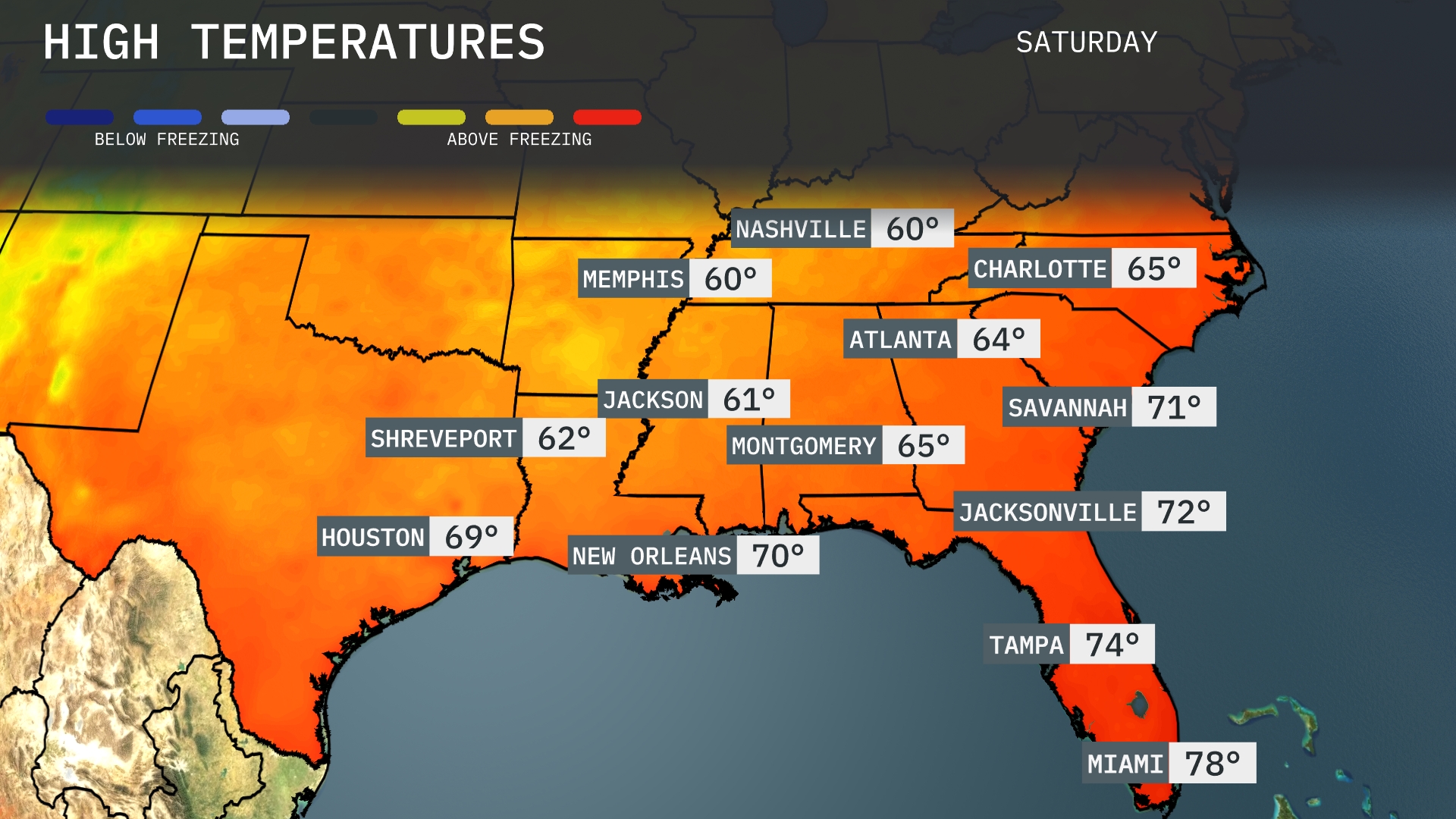 Tomorrow in the Southeast, Atlanta will see a high of 64 degrees, while Nashville is set at 60. Montgomery, Alabama, will warm up to 65 degrees. Temperatures will reach 70 degrees in New Orleans, with Jacksonville hitting 72. Miami is expected to feel pleasant with a high of 78 degrees, maintaining above-average readings across the region.