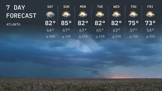 Experience all dimensions of Atlanta’s changing weather. From mild mornings at 70°F to afternoon thunderstorms, we cover your week ahead. Expect highs reaching the mid-80s and lows at a cool 54°F. Stay tuned for updates on potential rainfall and daily UV index readings.
