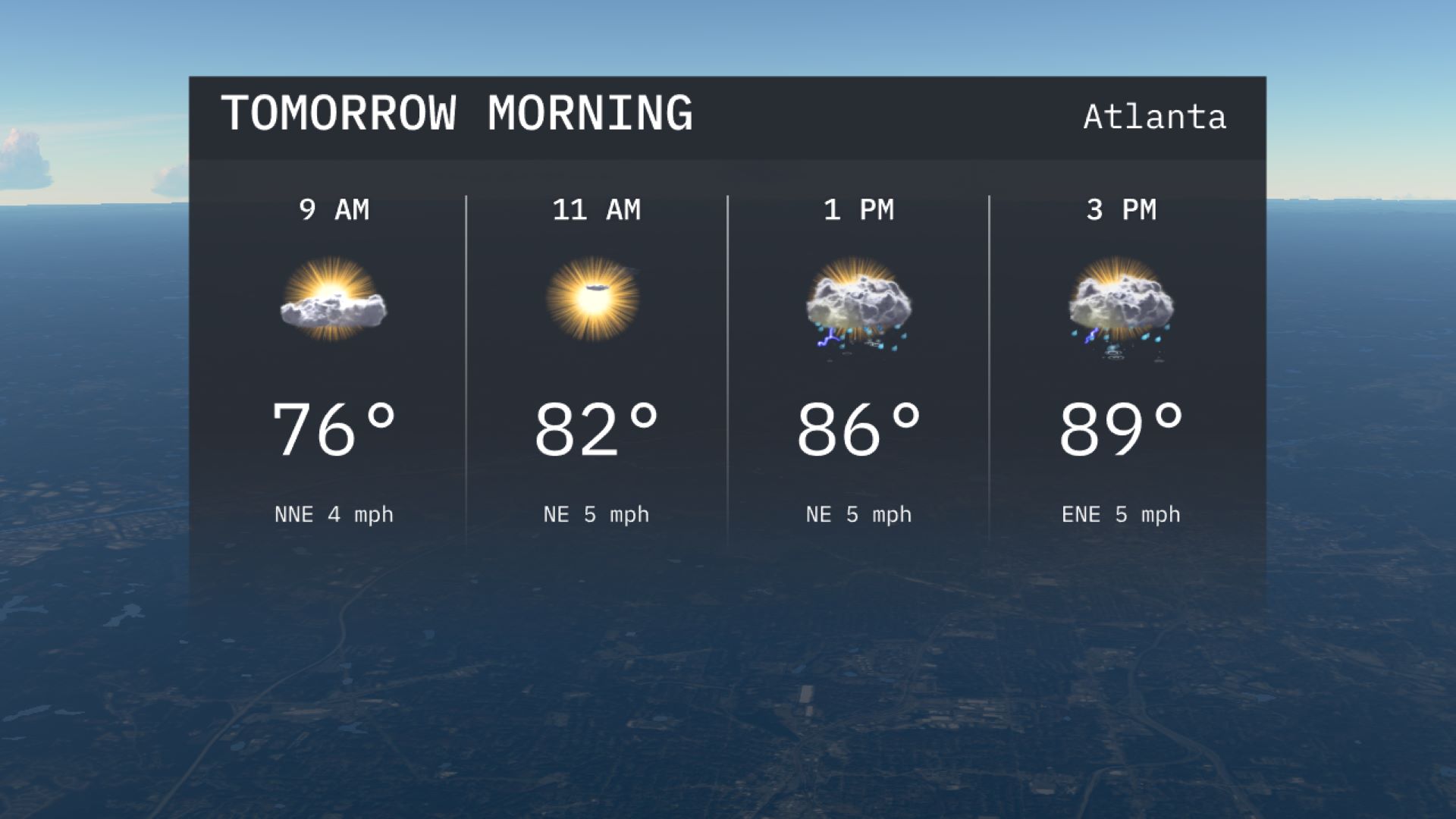 Tomorrow morning in Atlanta will start with temperatures at 76 degrees by 9 AM. Expect partly cloudy skies, setting the stage for mostly sunny conditions by 11 AM with temperatures rising to 82 degrees. Winds will be light, coming from the northeast at 4 to 5 miles per hour, providing a gentle start to the day.