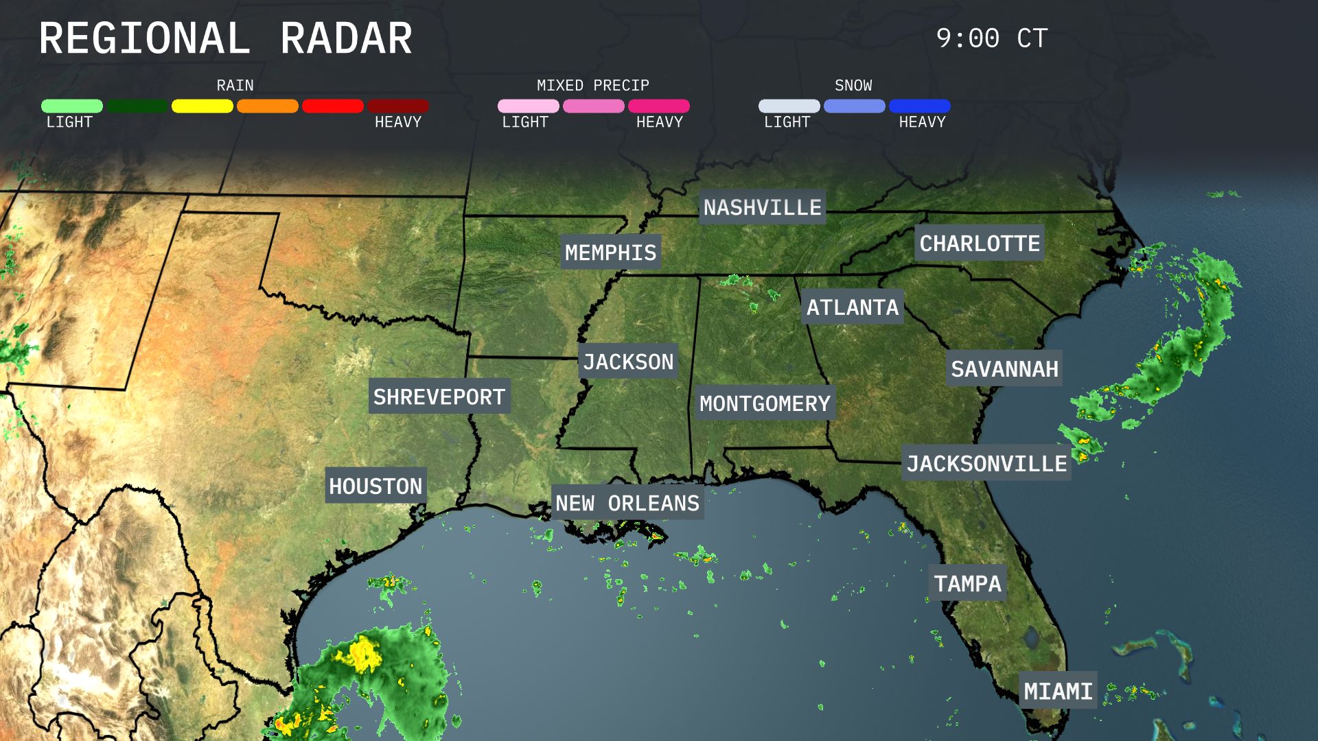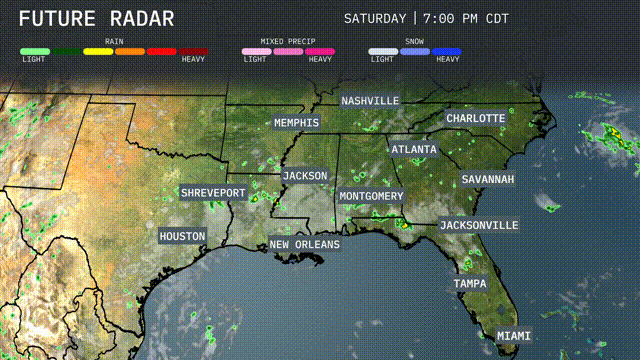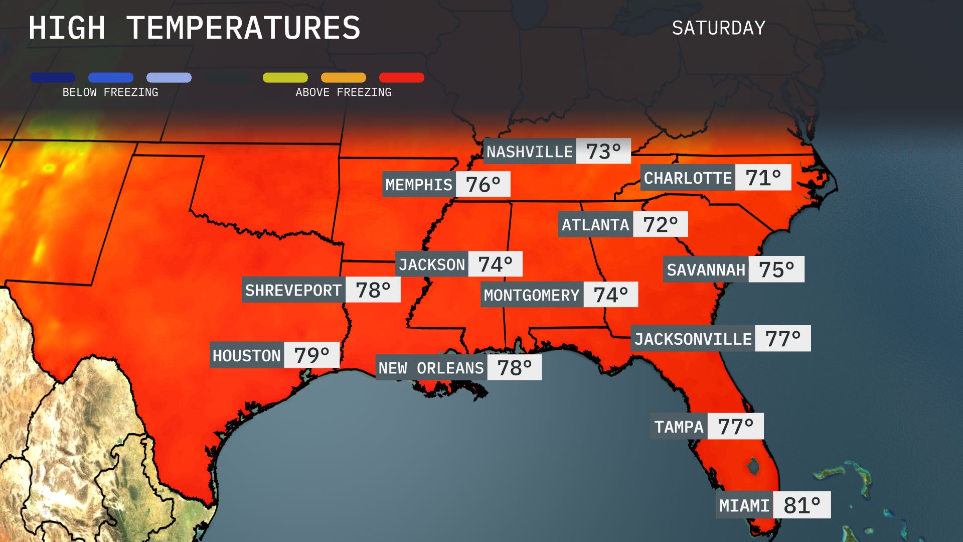 Tomorrow, temperatures will be on the warmer side across the Southeast. Atlanta is expected to rise to 72 degrees, while Nashville will hit 73. Jackson and Montgomery will see highs of 74 and 74 respectively, with Memphis warming up to 76. New Orleans will be quite warm at 78 degrees, and Miami will lead the pack with a high of 81.