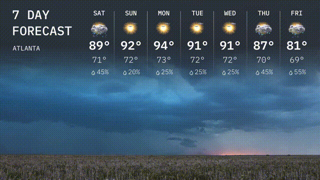 Welcome to your detailed weather forecast for Atlanta. As we step into tomorrow, temperatures will start at a comfy 76 degrees, escalating to a warmer 93 by midday. Tonight promises a cooling down with a low of 72 degrees. But that’s not all—expect varied conditions throughout the week from sunny days to potential thunderstorms across the Southeast. Dive into our 7-day outlook to stay ahead of the weather and plan your week seamlessly!
