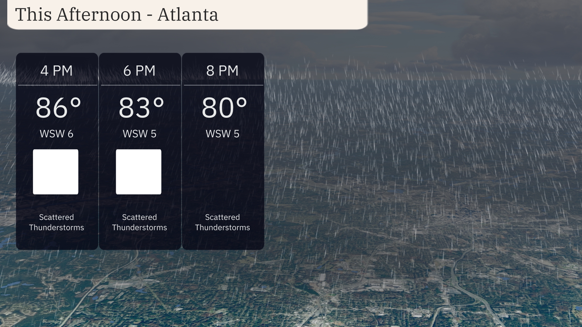 Temperatures in Atlanta this afternoon will reach 86 degrees by 4 PM, with scattered thunderstorms likely. Winds will come from the west-southwest at 6 mph, dropping to 5 mph by 6 PM when the temperature slightly decreases to 83 degrees. Thunderstorm activity continues, so keep an umbrella handy. By 8 PM, temperatures will ease to 80 degrees, with winds remaining steady and storms tapering off.