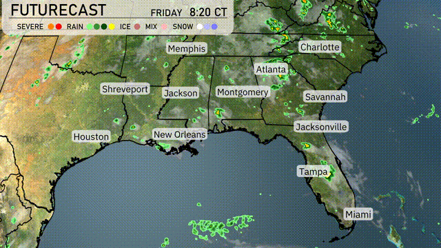 A cold front is set to sweep through the Southeast tomorrow, sparking scattered thunderstorms from Shreveport to Savannah. Expect strong winds and brief downpours, especially along the Gulf Coast from New Orleans to Jacksonville. The system could bring localized flooding, so stay alert and mindful of rapidly changing conditions. By evening, cooler and drier air stabilizes over Memphis and Atlanta, bringing a respite from today’s storms. Temperatures are projected to drop slightly, with clearer skies settling in behind the front.