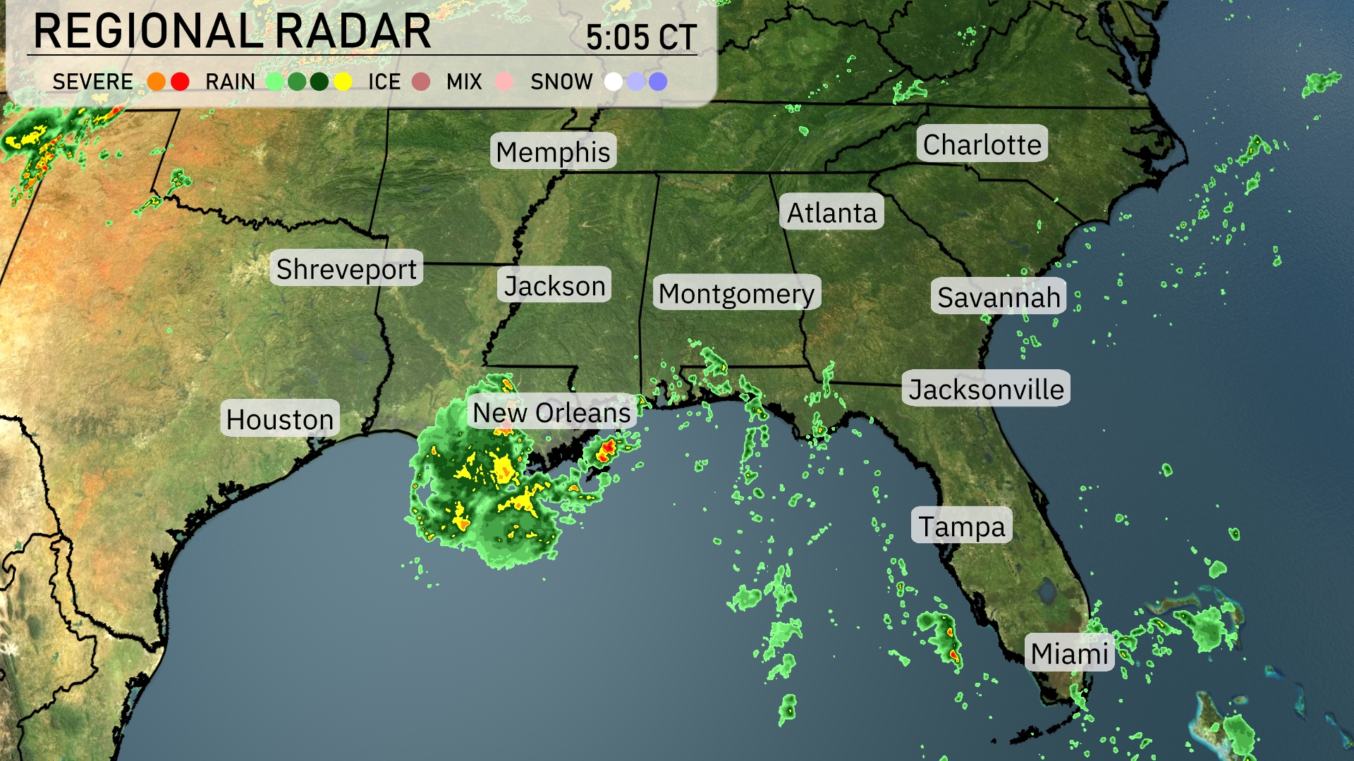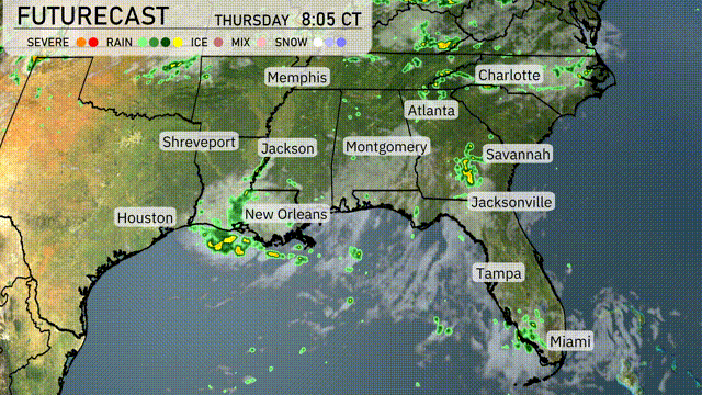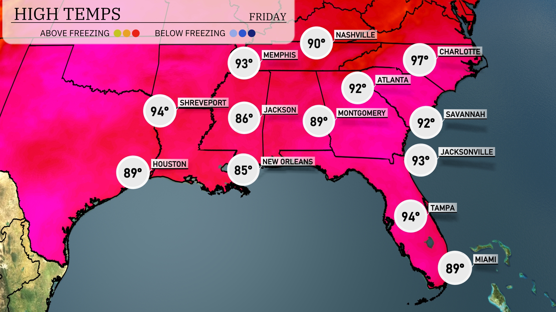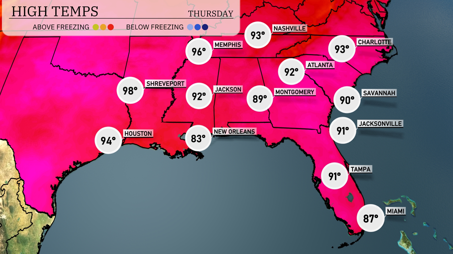 Tonight, look for a low of 74 degrees in Jackson and Montgomery. Memphis will drop slightly to 75 degrees, while Nashville cools down to 73. Expect temperatures to be a bit warmer along the coast, with Jacksonville and Savannah at 75 degrees and a balmy 82 in Miami. Houston remains steamy at 78 degrees, keeping the warm air pattern in place for much of the Southeast.