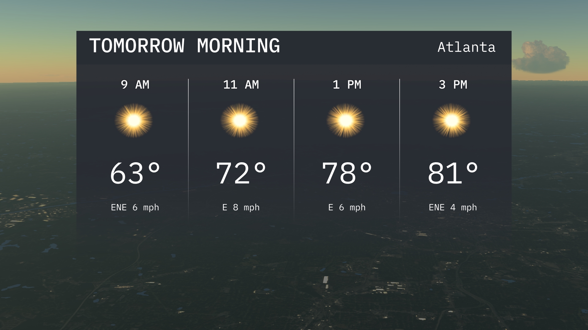 Tomorrow morning in Atlanta, expect clear skies with abundant sunshine. Temperatures will start at 63 degrees at 9 AM, gradually rising to 72 degrees by 11 AM. Winds will be light throughout the morning, coming from the east-northeast at 6 to 8 miles per hour.