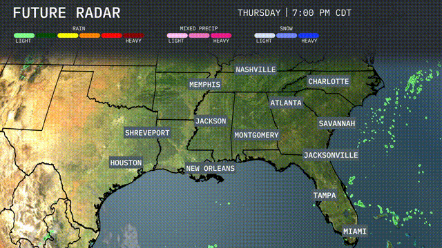Tomorrow, temperatures across the Southeast will be notably cool with highs generally below average. Atlanta will reach just 57 degrees, while Montgomery and Jackson will see similar highs of 61 degrees. Memphis is slightly warmer at 63 degrees, and New Orleans will hit 68. Moving to the coast, Jacksonville expects a high of 63, and Tampa will be a bit warmer at 67 degrees. Miami stands out with a pleasant high of 74 degrees, providing a stark contrast to the cooler air moving through the region.