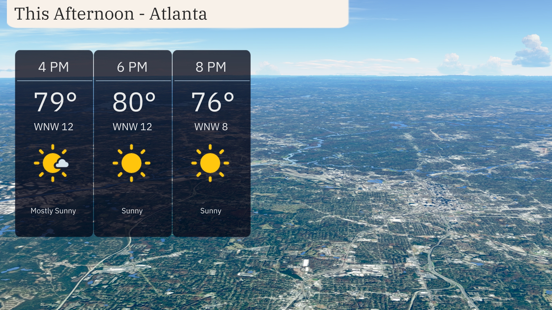 Temperatures in Atlanta this afternoon will rise to 80 degrees by 6 PM, with mostly sunny skies. Expect a gentle breeze from the west-northwest at around 12 miles per hour, providing a comfortable outdoor atmosphere. By 8 PM, temperatures will slightly decrease to 76 degrees as the sun continues shining, bringing a pleasant end to the afternoon.