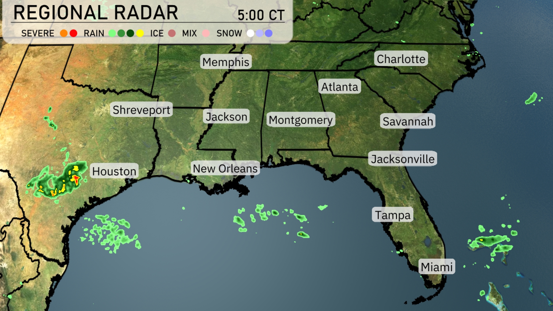 Currently, the Southeast region is experiencing isolated showers, particularly affecting coastal areas near New Orleans with more rain developing southwest of Houston. These bands of showers are moving eastward, potentially reaching coastal Mississippi and Alabama later. Clear skies prevail across central Georgia and most of the Carolinas, providing a pleasant reprieve. Montgomery to Jacksonville is also enjoying dry conditions under mostly clear skies. Charlotte and Memphis are clear too.