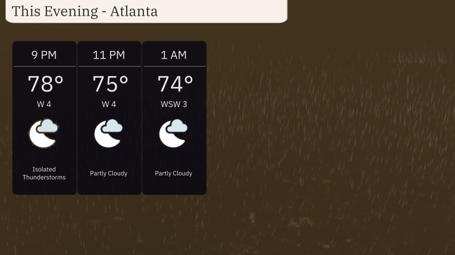 For this evening in Atlanta, the weather includes varying conditions. The temperature will start at 78 degrees with isolated thunderstorms at 9 PM, shifting to partly cloudy skies by 11 PM as temperatures drop to 75 degrees. By 1 AM, it will remain partly cloudy with a temperature of 74 degrees, and winds from the west-southwest at around 3 mph. Be prepared for a possible thunderstorm early in the evening, calming to more settled weather as the night progresses.