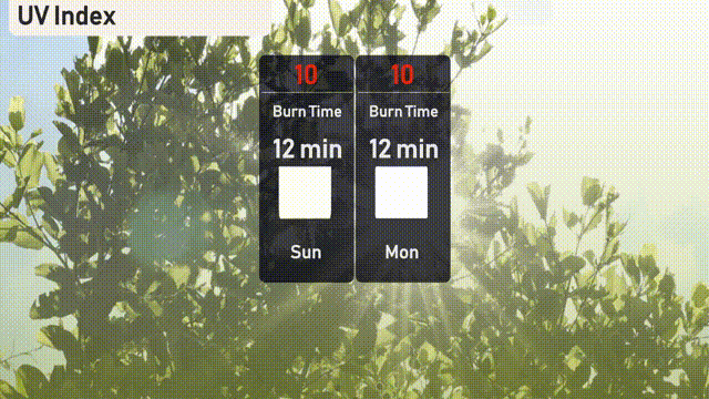 The UV index in Atlanta is very high at 10 for both Sunday and Monday, with a burn time of just 12 minutes in direct sunlight. Make sure to limit your sun exposure and seek shade when possible. Protective measures such as sunscreen and hats are highly advised.