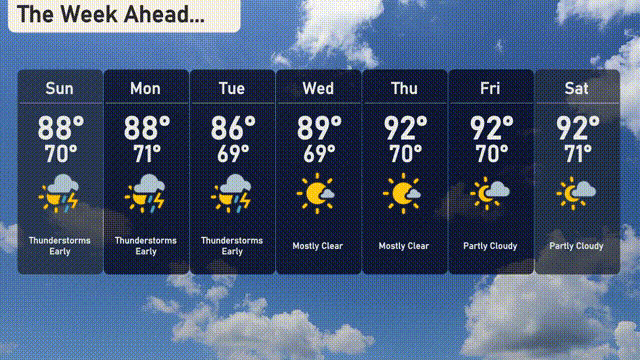 Sunday: Thunderstorms are expected with a high of 88 degrees and a low of 70 degrees.