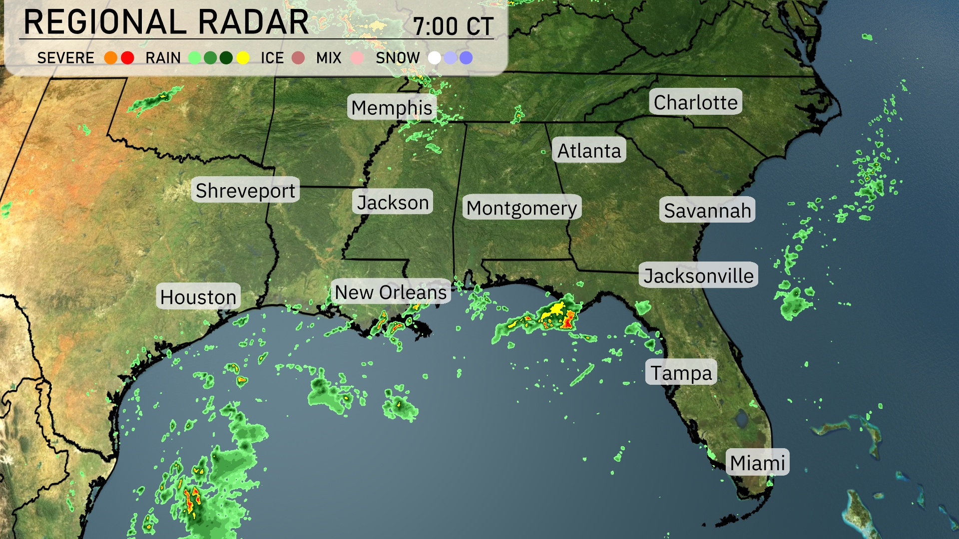 On the Regional Radar, showers are predominant over the Gulf Coast, particularly in Southern Louisiana near New Orleans, with storms moving towards the Florida Panhandle, impacting areas around Panama City. Rain is also visible extending from Jacksonville towards the Atlantic Ocean. The interior Southeast, including cities like Atlanta and Charlotte, remains mostly clear, providing a quiet weather day. Scattered clouds can be seen drifting through the lower Mississippi Valley, possibly bringing light rain to parts of Mississippi and Alabama later on.