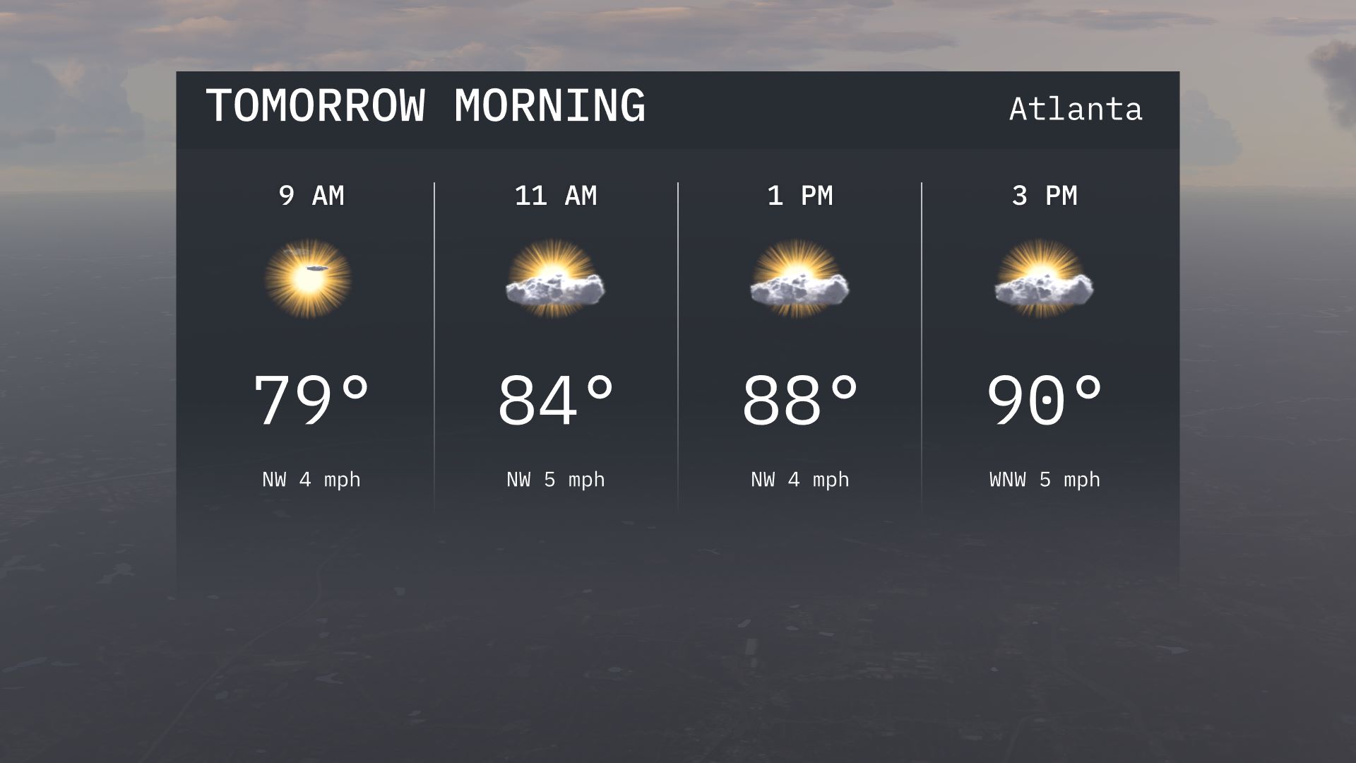 Atlanta’s temperatures tomorrow morning start at 79 degrees under sunny skies, transitioning to 84 degrees by 11 a.m. A light northwest wind will be present.