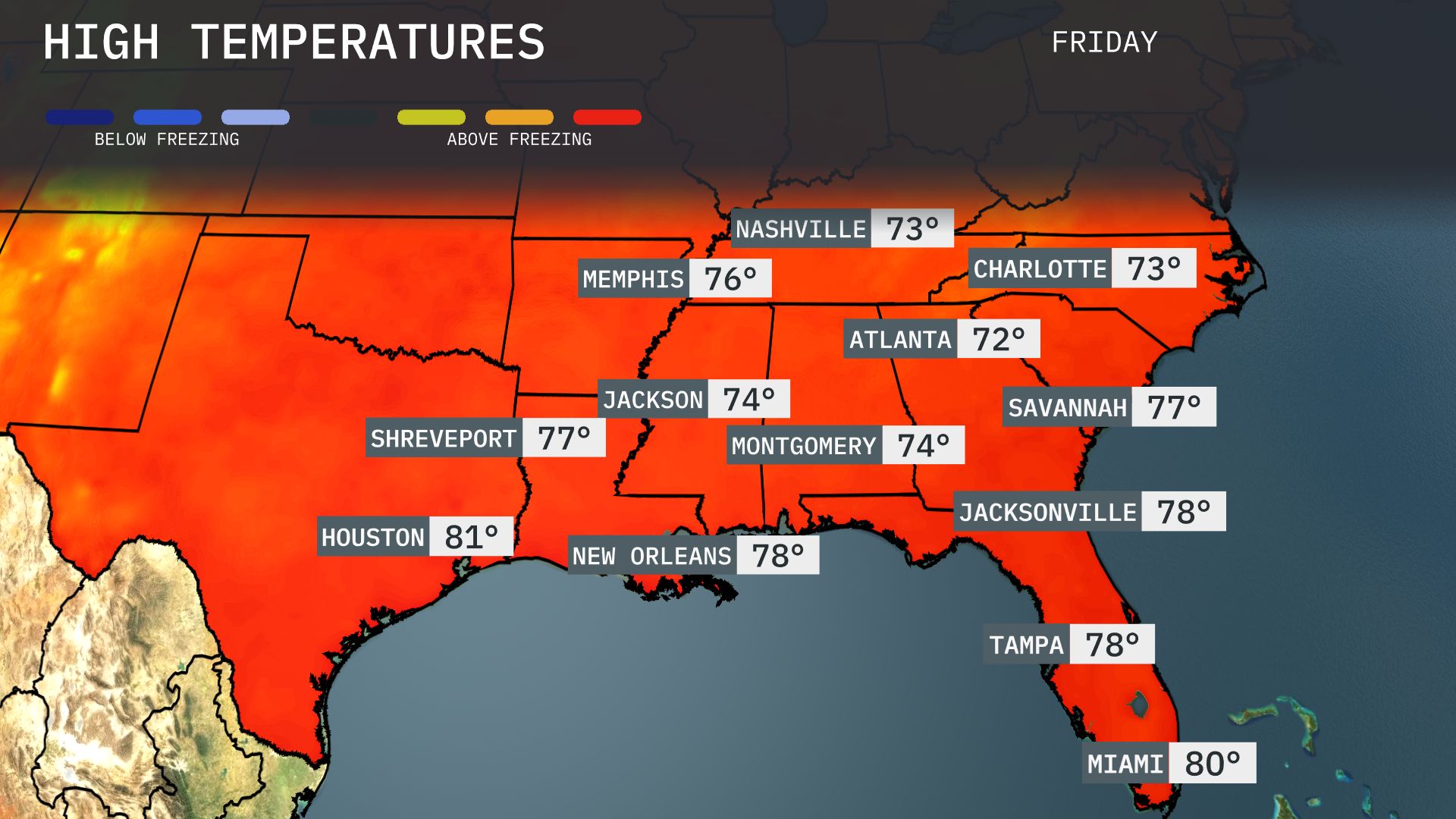 Tomorrow, high temperatures in the Southeast will see a warm uptick, with Houston reaching 81 degrees. New Orleans will enjoy a pleasant 78 degrees, while Memphis is set for a high of 76. In contrast, Atlanta and Nashville will be cooler, with highs around 72 and 73 degrees, respectively. Jacksonville is expected to see a slightly warmer day at 78 degrees.