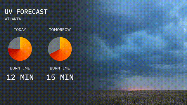 The UV index in Atlanta has reached a high level today, leading to a burn time of 12 minutes in direct sunlight. For tomorrow, expect a similar scenario with a slight increase in burn time to 15 minutes.